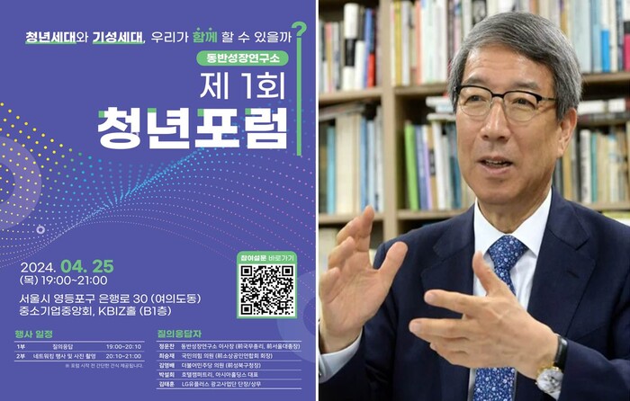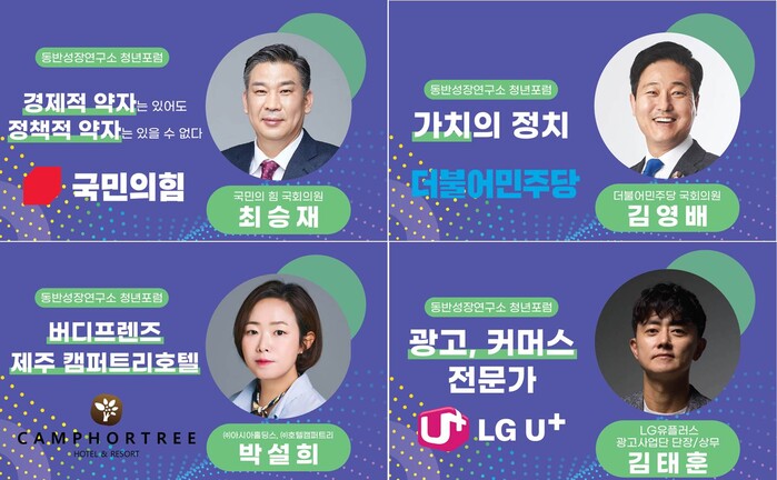 이번 청년 포럼은 정운찬 동반성장연구소 이사장(전 국무총리, 전 서울대 총장), 최승재 국민의힘 국회의원, 김영배 더불어민주당 국회의원, 박설희 대표(캠퍼트리호텔·버디프렌즈 CEO), 김태훈 상무(LG유플러스 광고커머스 사업단)가 청년의 물음에 대답하는 응답자로 참석한다.