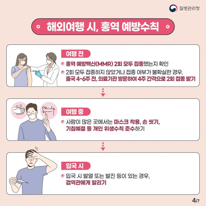 보건소 관계자는“해외여행 이후 발열을 동반한 기침, 콧물, 결막염 또는 발진 등의 증상을 보인다면 바로 의료기관 방문하여 해외 여행력을 알리고 진료를 받을 것과, 의료기관에서도 검사 및 관할 보건소 신고 등을 적극적으로 해줄 것”을 당부하였다.