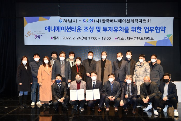 경기 하남시가 지난 24일 (사)한국애니메이션제작자협회 총회에 참석해 기업유치 설명회를 추진하고, 애니메이션타운 조성을 위한 업무협약을 맺었다. 사진은 이날 김상호 시장(앞줄 왼쪽 세 번째)이 관계자들과 기념촬영을 하는 모습. (사진제공=하남시청)