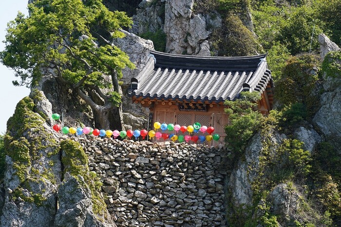 좁은 바위틈 석축을 쌓아올린 지반 위에 제비집처럼 매달린 하늘끝 신비로운 암자, 도솔암.