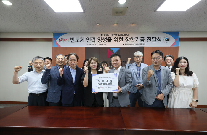 [용인=오왕석 기자] 용인예술과학대학교(총장 최성식)는 지난 19일 대학 본관 대회의실에서 용인시 반도체 장비 기업인 ㈜애플티(대표 이민근)로부터 반도체 인력양성을 위한 장학금 500만원을 기증받는 협약식을 가졌다.