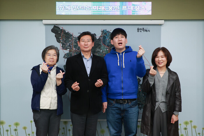 | ▲ 이상일 용인특례시장은 8일 시장 접견실에서 가상현실 스포츠 체험센터’ 외벽 벽화 조성에 참여한 유동혁 작가와 발달장애인 예술공동체 ‘아뜨리에 플레이 투게더’ 주상희 대표 |