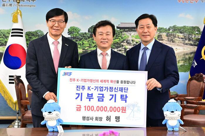 진주 K-기업가정신재단(이사장 정영수)은 허맹 ㈜행성사 회장이 진주 K-기업가정신재단에 현금 1억 원을 기부해 17일 진주시청 기업인의 방에서 ‘기부금 기탁식’을 가졌다고 밝혔다.