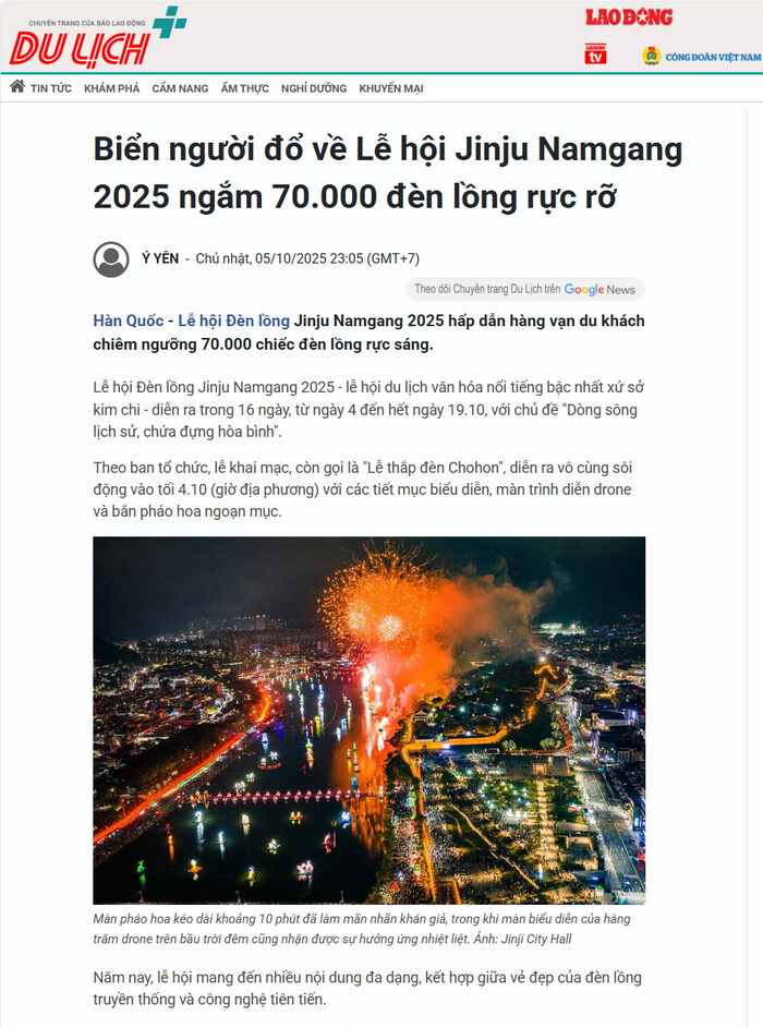 VOV는 “진주남강유등축제가 ‘역사의 강, 평화를 담다’를 주제로 열리며 7만 개 이상의 유등이 남강과 진주성을 밝히고 있다”며 “임진왜란 당시 유등이 통신과 신호의 수단으로 사용된 역사적 의미를 오늘날 평화와 화합, 희망의 상징으로 발전시켰다”고 소개했다.