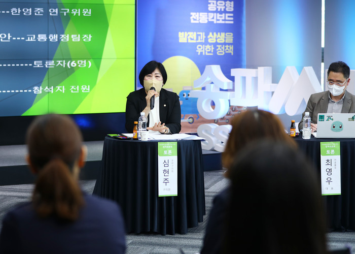 심현주 서울 송파구의회 의원이 최근 KT송파타워 3층 송파쌤 헤드센터에서 열린 공유형 전동킥보드(PM) 발전 및 상생 방안 마련을 위한 정책토론회에 참석해 토론을 진행했다. 사진은 토론을 하고 있는 심 의원의 모습. (사진제공=송파구의회)