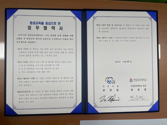 진주시와 연암공과대학교는 지난 10월 30일, 시민의 정보화 역량 강화와 평생교육 활성화를 목표로 AI 기반 평생학습 프로그램 개발 및 운영에 협력하는 업무협약을 체결했다.