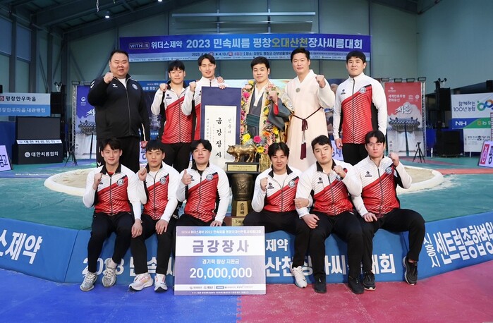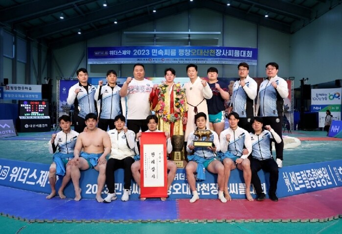| ▲ 영암군청 소속 민속씨름단 차민수 한라장사가 지난 8일부터 13일까지 강원도 평창군 진부생활체육관에서 열린 2023년 평창 오대산천 장사씨름대회에서 한라장사 우승를 거머쥐고 동료 선수들과 기념촬영을 하고 있다. / 영암군 제공 |