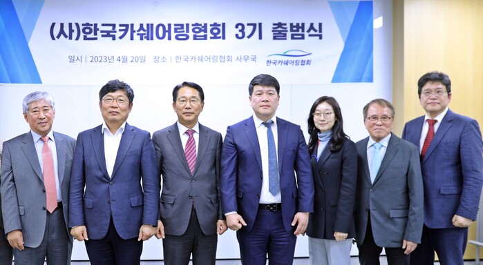 | ▲ (사)한국카쉐어링협회가 이창운 회장(사진 좌측 세 번째)을 중심으로 한 3기 출범식을 개최 후 주요 임원·자문단과 함께 기념 촬영을 하고 있다. (사진 좌측 두 번째 김재문 부회장, 우측 네 번째 김종열 부회장 우측 첫 번째 강휘진 감사) 사진=(사)한국카쉐어링협회 제공 |