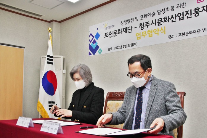 경기 (재)포천문화재단은 최근 청주시문화산업진흥재단과 상생발전 및 문화예술 활성화를 위한 업무협약을 체결했다.이날 협약으로 양기관은 협력전시 '시時스루through'전을 개최하며, 오는 3월8~27일 포천반월아트홀 전시장에서 진행된다. 사진은 협약식에서 관계자들이 협약서에 서명을 하는 모습. (사진제공=포천시청)
