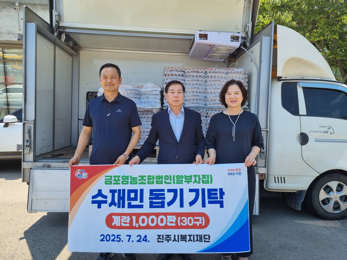 금포영농조합법인(대표 문국동)은 24일 기록적인 폭우로 피해를 입은 진주시민을 돕기 위해 계란 1,000판(환가액 700만 원 상당)을 진주시복지재단(이사장 이성갑)에 기탁했다.