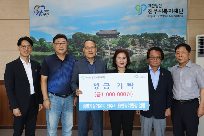바르게살기운동 진주시 읍면동 위원장(위원장 김성덕 외 29명)은 최근 집중호우로 피해를 입은 진주지역 주민들을 돕기 위해 진주시복지재단에 성금 100만 원을 기탁했다.