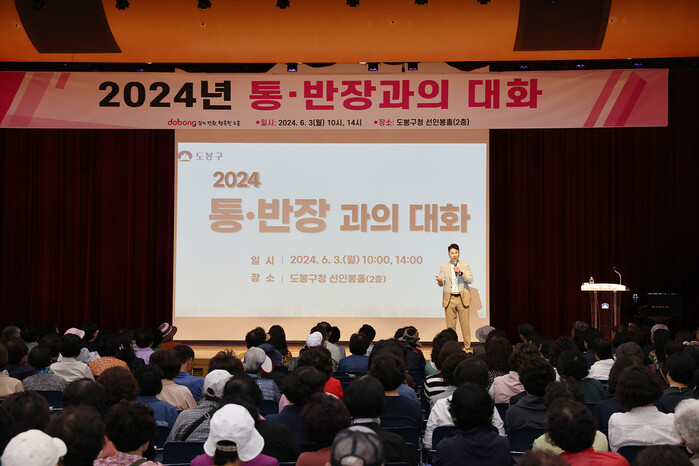 서울 도봉구는 지난 3일 ‘통·반장과의 대화’를 개최해 구청장 인사말을 시작으로 통·반장 역할 안내, 구정 현안 진행상황 공유 등의 순으로 이어졌다. 사진은 오언석 구청장이 ‘통·반장과의 대화’에서 발표를 진행하고 있는 모습.(사진=도봉구청 제공)