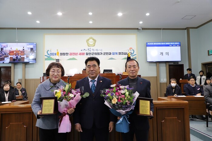 [김해=최성일 기자] 함안군의회(의장 곽세훈)는 정금효 의원과 안말남 의원이 군민중심의 의정활동과 지역사회 발전에 앞장선 공로를 인정받아‘경상남도 의정봉사상’을 수상했다고 밝혔다.