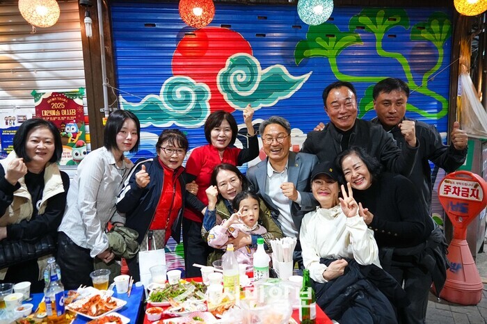 | ▲ 강기정 광주광역시장이 8일 오후 동구 대인시장에서 열린 대인예술야시장을 방문해 상인들을 격려하고 애로사항을 청취한 뒤 기념촬영을 하고 있다. /광주광역시 제공 |