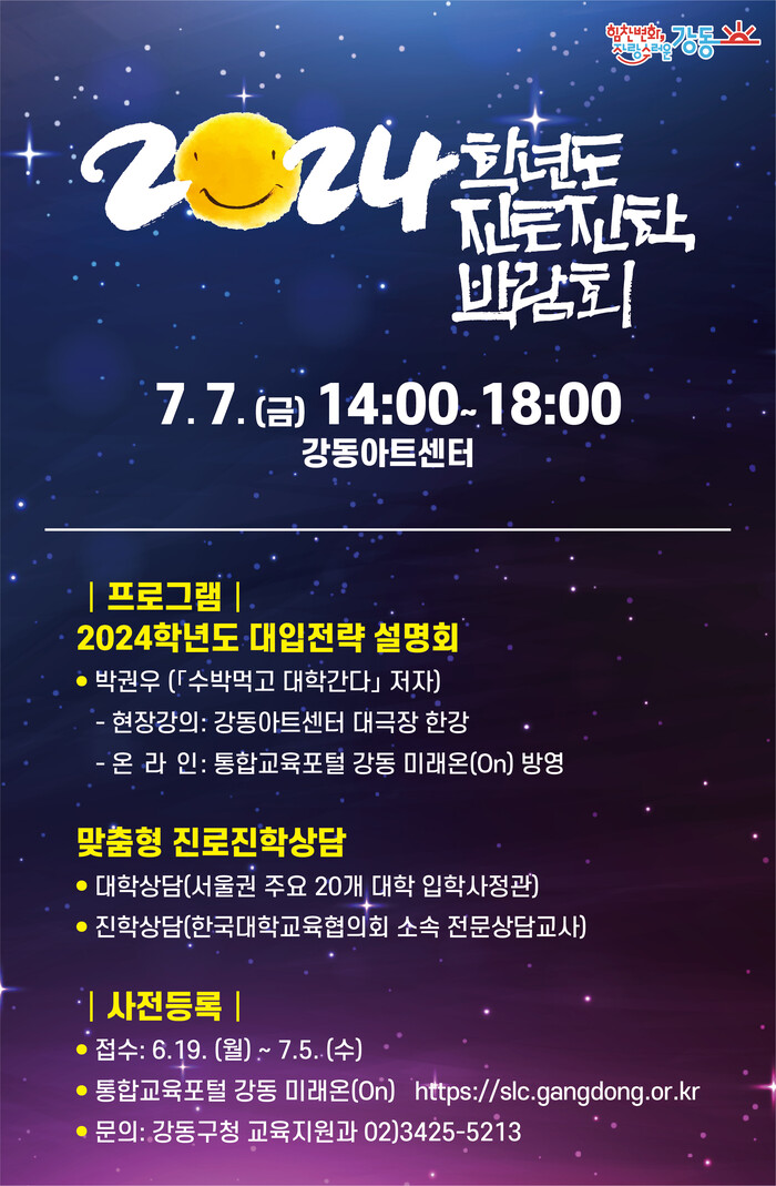 [시민일보 = 이대우 기자] 서울 강동구(이수희 구청장)가 오는 7월7일 강동아트센터 대극장에서 ‘2024학년도 원스톱 진로진학박람회’를 온·오프라인 동시에 개최한다.
