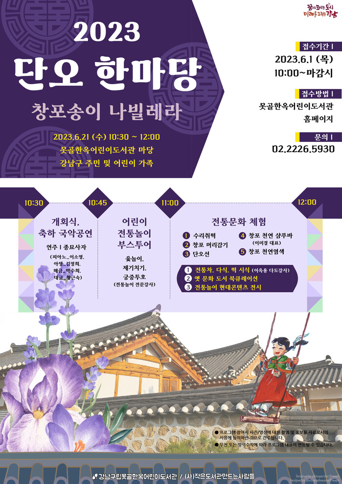 못골한옥어린이도서관은 전통 한옥 건물과 넓은 마당을 활용해 구민과 어린이들이 단오를 체험할 수 있는 다양한 행사를 준비했다. ▲단오절의 대표 음식인 수리취떡 만들기 ▲여름나기 건강 대비를 위한 창포 머리감기 ▲단오에 임금이 신하들에게 하사했다는 단오선 만들기 ▲창포 샴푸바 만들기 ▲창포 천연염색 체험을 할 수 있다.
