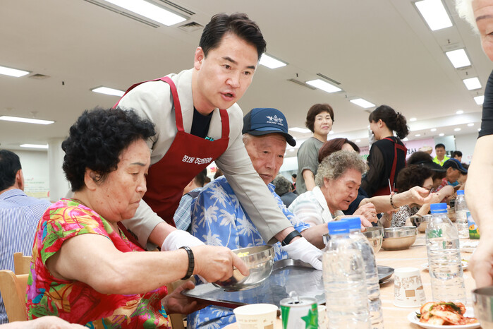 서울 도봉구 창1동 주민자치회와 창1동 지역사회보장협의체는 최근 무더위에 취약한 홀몸노인 등을 대상으로 건강한 여름나기를 위한 ‘사랑의 복달임 삼계탕 나눔’ 행사를 진행했다. 사진은 오언석 구청장(왼쪽 두번째)이 지역내 무더위에 지친 노인들을 위해 삼계탕을 나르고 있는 모습.(사진=도봉구청 제공)