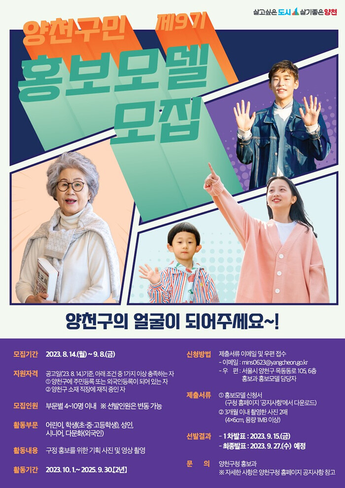 [시민일보 = 이대우 기자] 서울 양천구(구청장 이기재)가 ‘제9기 양천구 홍보 모델’을 선발한다고 밝혔다.
