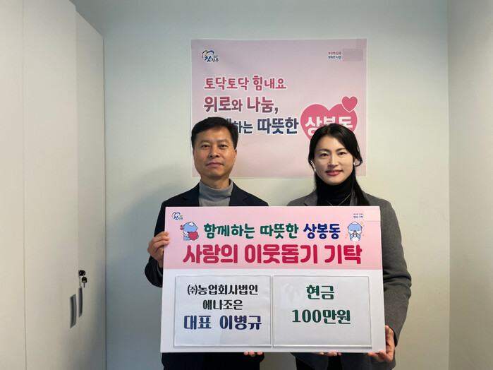 진주시 상봉동행정복지센터는 21일 설 명절을 맞아 ㈜농업회사법인 에나조은(대표 이병규)에서 어려운 이웃들을 위해 사용해 달라며 현금 100만 원을 기탁했다고 밝혔다. 이날 기탁받은 현금은 진주시복지재단을 통해 저소득층 10가구에게 전달될 예정이다.