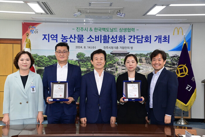 이날 간담회에는 조규일 진주시장과 한국맥도날드 대외협력담당 양형근 이사, 메뉴 매니지먼트팀 백창호 팀장, 브랜드 마케팅팀 전온희 팀장이 참석한 가운데, 시에서는 지난 7월 한국맥도날드 한국의 맛 신메뉴로 출시한‘진주 고추 크림치즈 버거와 머핀’프로젝트의 성공적인 결과에 감사의 마음을 담은 감사패를 한국맥도날드에 전달하기도 했다.
