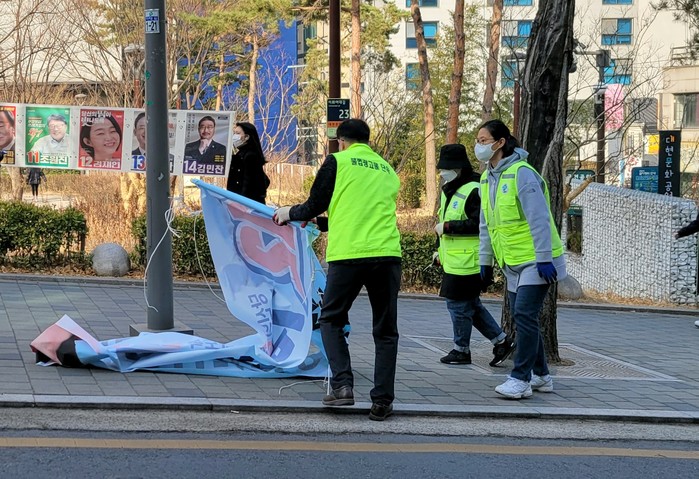 서울 서대문구청 직원들이 대선 이튿날인 지난 10일 지역내 대현동에서 직원 20명으로 4개조를 편성해 대선 관련 현수막을 철거했다. 사진은 이날 직원들이 선거 현수막을 철거하고 있는 모습.(사진제공=서대문구청)