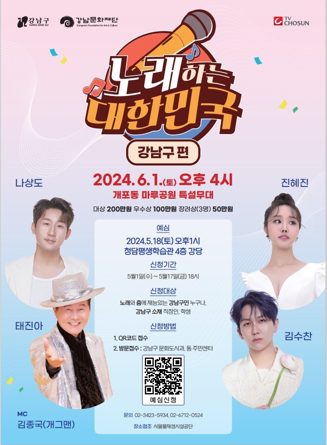 [시민일보 = 이대우 기자] 서울 강남구(구청장 조성명)가 6월1일 16시~18시 30분 개포동 마루공원에서 ‘2024 노래하는 대한민국-강남구편’을 개최한다.