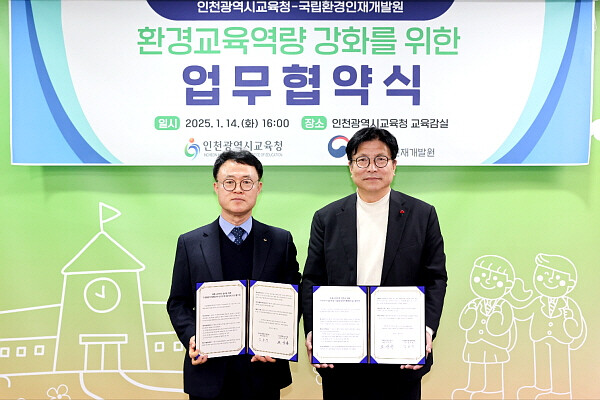 [인천=김형만 기자] 인천시교육청은 1월 14일 국립환경인재개발원과 교원의 환경교육 역량 강화를 위한 업무협약(MOU)을 체결했다.