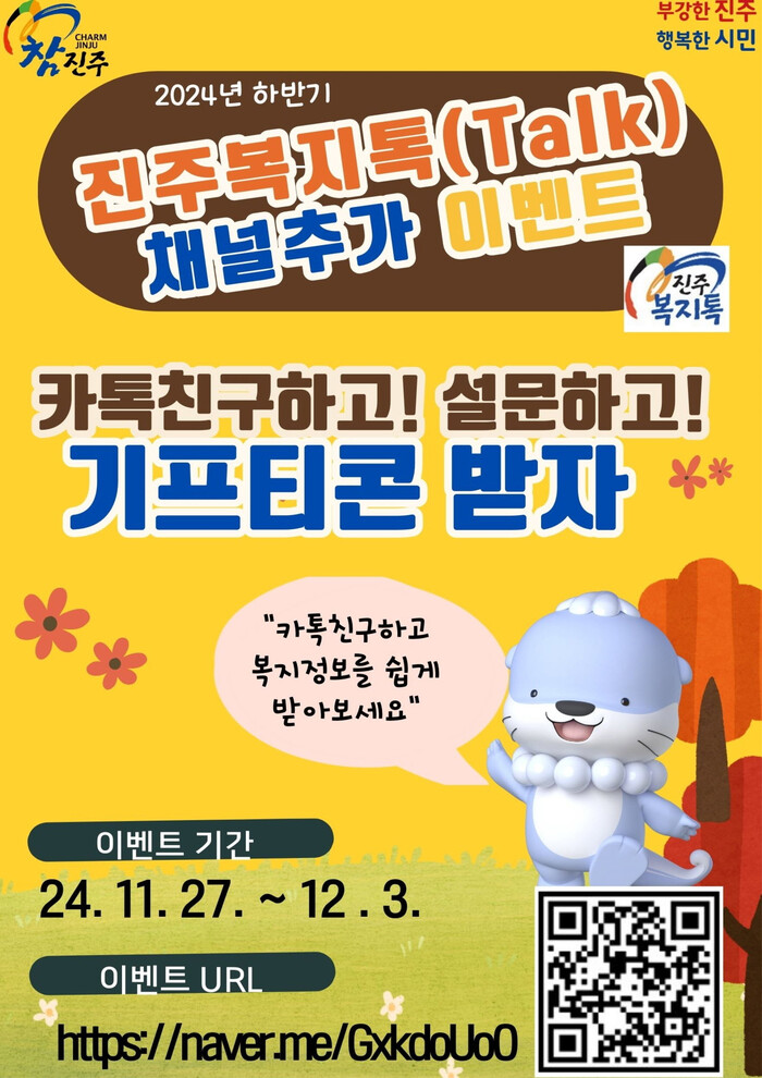 진주시는 진주복지콜센터(이하 콜센터)에서 운영하는 ‘진주복지톡(TALK)’채널 친구 추가 2024년 하반기 이벤트를 실시한다.