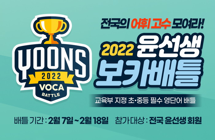 [시민일보 = 여영준 기자] 영어교육 전문기업 윤선생은 오는 7~18일 2주 동안 새 학년을 준비하는 전국 윤선생 학습 회원을 대상으로 ‘2022 윤선생 보카배틀(VOCA Battle)’ 대회를 연다.