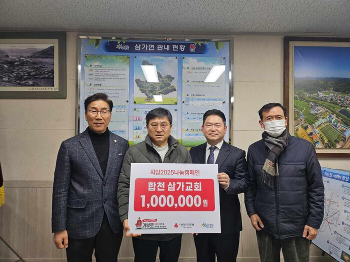 서문병관 삼가면장은 “매년 꾸준히 나눔을 실천해 주시는 한동근 목사님과 교회 관계자분들께 깊이 감사드린다”며 “기탁해 주신 성금은 도움이 필요한 이웃들에게 소중히 전달하겠다”고 전했다.