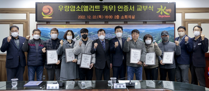 이날 인증서 교부식에는 합천군수를 비롯한 전국한우협회 강종덕 합천군지부장, 한국종축개량협회 오종렬 부산울산경남본부 팀장이 참석한 가운데 합천군 우량암소 보유현황설명, 인증서 및 기념패 수여, 기념촬영, 합천한우발전방안 논의 순으로 진행했다.