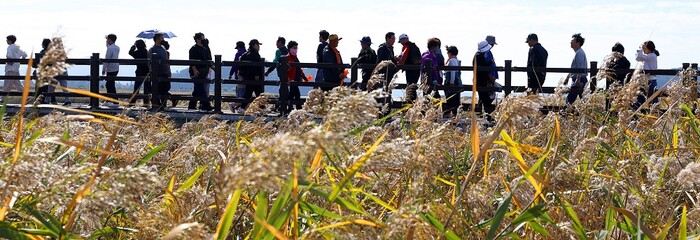 | ▲ 강진만생태공원 갈대밭 사이에 놓인 데크길을 걷고 있는 관광객들 / 강진군 제공 |
