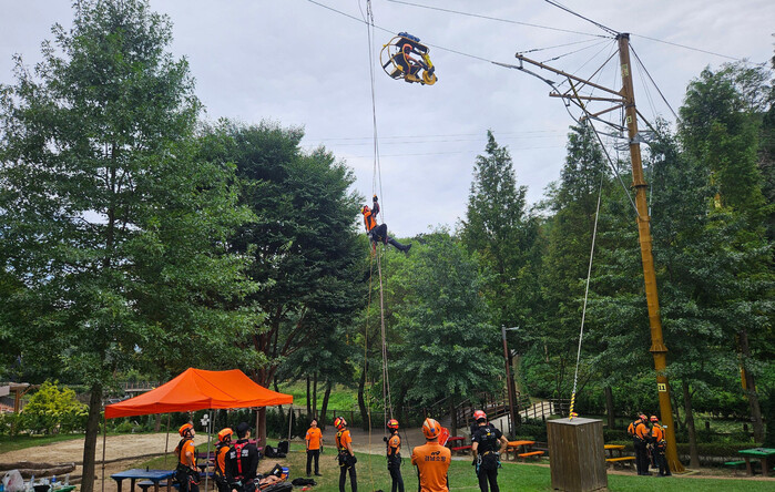 이날 진주시는 산림레포츠 시설의 특성상 와이어로프를 사용하는 구조물이 많아 체험 장비의 탈선 및 고장 등 사고가 발생할 가능성에 대비해 구난구조 장비를 활용한 자체 구난구조 능력을 점검하고, 경남 6개 소방서와의 공동 대응 및 신속한 구조를 위한 체계적인 훈련을 실시했다.