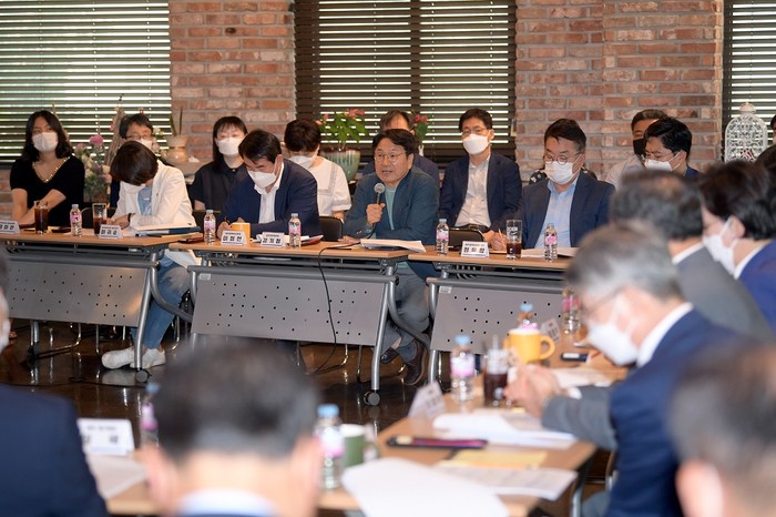 | ▲ 강기정 광주광역시장이 23일 오후 소촌 아트팩토리에서 열린 행정구역 개편 관련회의에 참석해 지역 국회의원, 교육감, 5개 구청장 등과 함께 의견을 나누고 있다. /광주광역시 제공 |