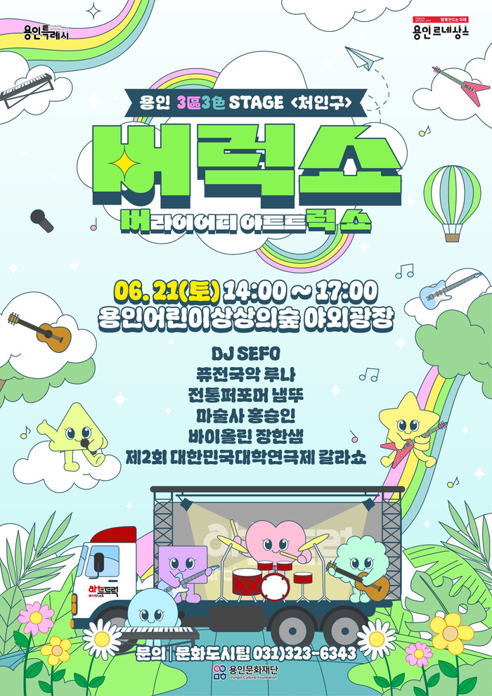 [용인=오왕석 기자] 용인문화재단(이사장 이상일)은 오는 6월 21일(토) 용인어린이상상의숲 광장에서2025 아트트럭 기획공연『용인 3區3色 STAGE : 처인구 《버라이어티 아트트럭 쇼》』(이하 ‘버럭쇼’)를 개최한다.