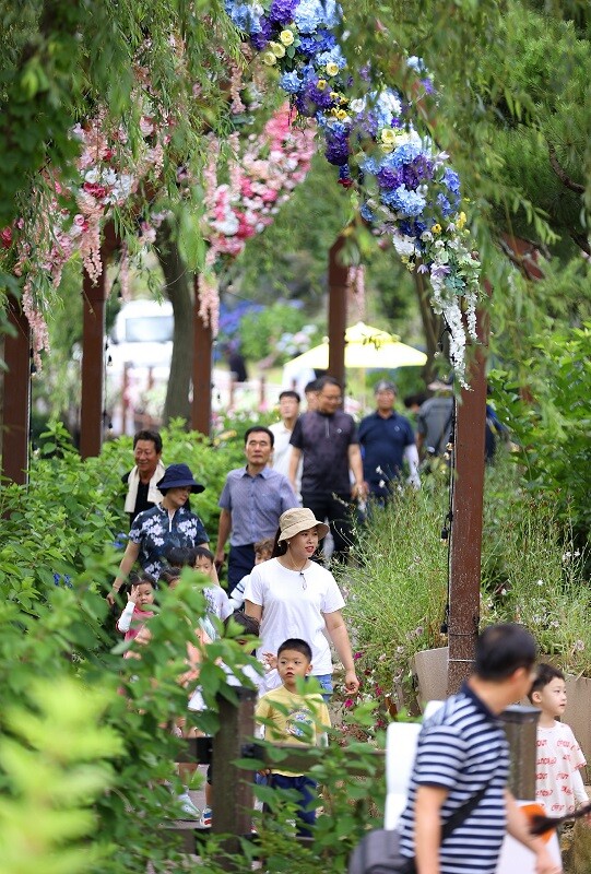 | ▲ 수국길 축재장을 찾은 관광객과 지역민들 / 강진군 제공 |