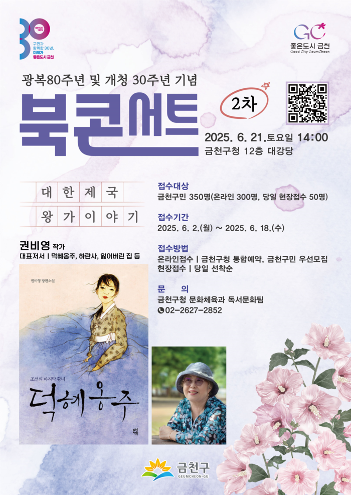 [시민일보 = 여영준 기자] 서울 금천구(구청장 유성훈)는 오는 21일 오후 2시 구청 12층 대강당에서 광복 80주년과 개청 30주년을 기념해 권비영 작가와 함께하는 ‘북콘서트’를 개최한다고 밝혔다.