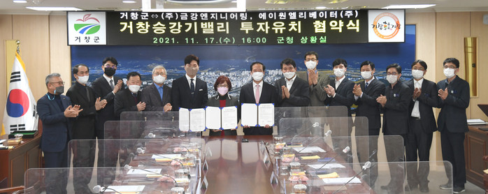 거창군은 17일 군청 상황실에서 유망 승강기업체인 ㈜금강엔지니어링과 에이원엘리베이터(주) 2개사와 40억 규모의 투자협약을 체결했다.