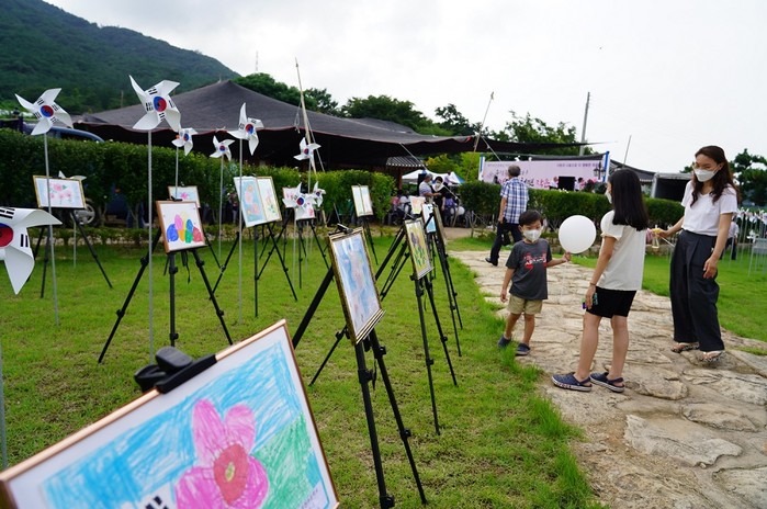 | ▲ 해남군 옥천면 영신리 양한묵 선생 생가 및 기념관에서 열린 작은 무궁화 축제장을 찾은 한 가족들이 전시된 작품들을 감상하고 있다. / 사진=해남군 제공 |