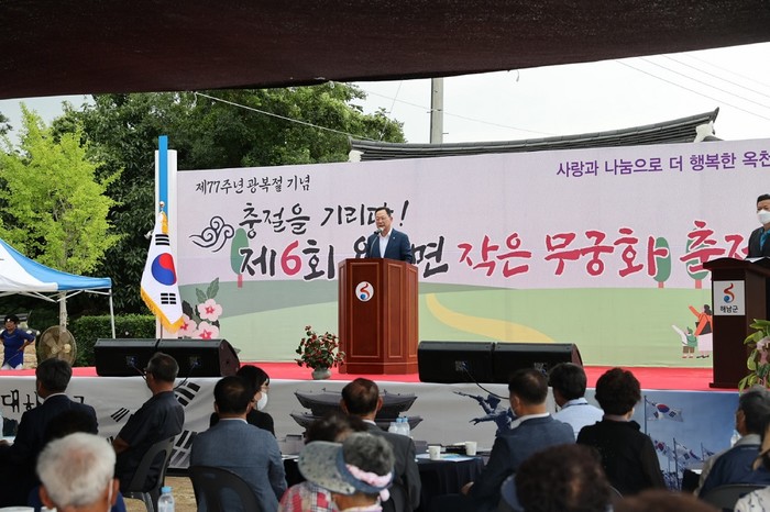 | ▲ 명현관 해남군수가 지난 12일 제 77주년 광복절 기념일을 맞아 3.1운동 민족대표 33인 중 한 분이신 옥천면 출신 양한묵 선생의 뜻을 기리는 제6회 옥천면 작은 무궁화 축제에서 인사말을 하고 있다. / 사진=해남군 제공 |