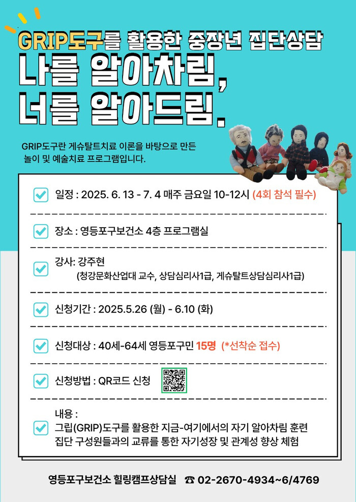 [시민일보 = 여영준 기자] 영등포구(구청장 최호권)가 퇴직, 사별, 자녀 독립 등으로 사회적 관계망이 축소되기 쉬운 40세~64세 중장년층을 대상으로, 자기이해와 대인관계 능력 향상을 돕기 위해 ‘그립(GRIP)도구를 활용한 집단상담’ 프로그램을 운영한다고 밝혔다.