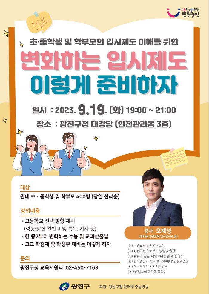[시민일보 = 여영준 기자] 서울 광진구(구청장 김경호)가 오는 19일 구청 대강당에서 ‘고입 설명회’를 개최한다.
