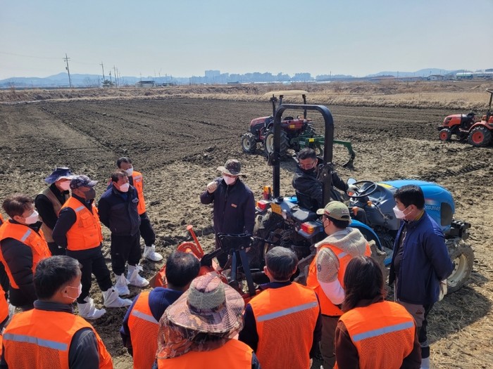 김포시농업기술센터가 본격적인 영농철을 맞아 농업인들의 임대농기계 이용 편의를 위해 최근 8일에 거쳐 농용굴삭기, 소형트랙터, 보행관리기 현장 안전사용 교육을 진행했다. 사진은 교육이 이뤄지고 있는 모습. (사진제공=김포시청)