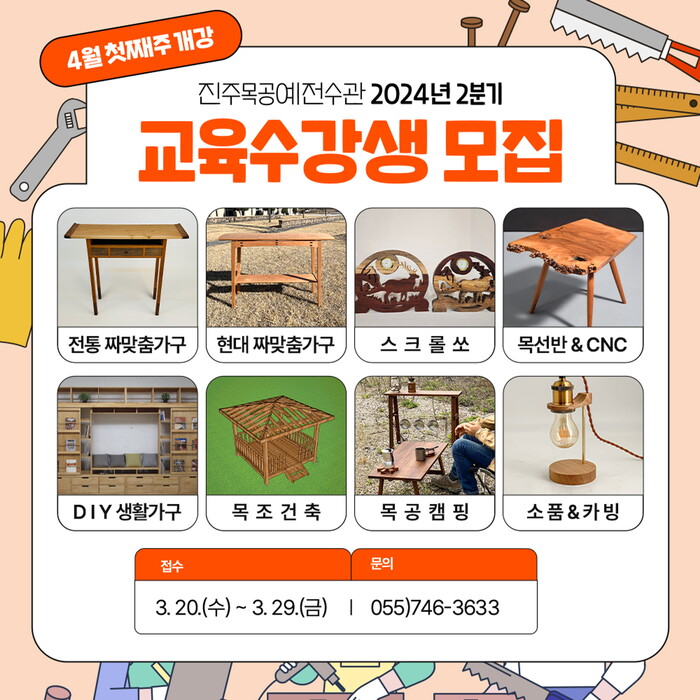 진주목공예전수관은 3월 20일부터 29일까지 4월 교육프로그램 수강생을 모집한다.