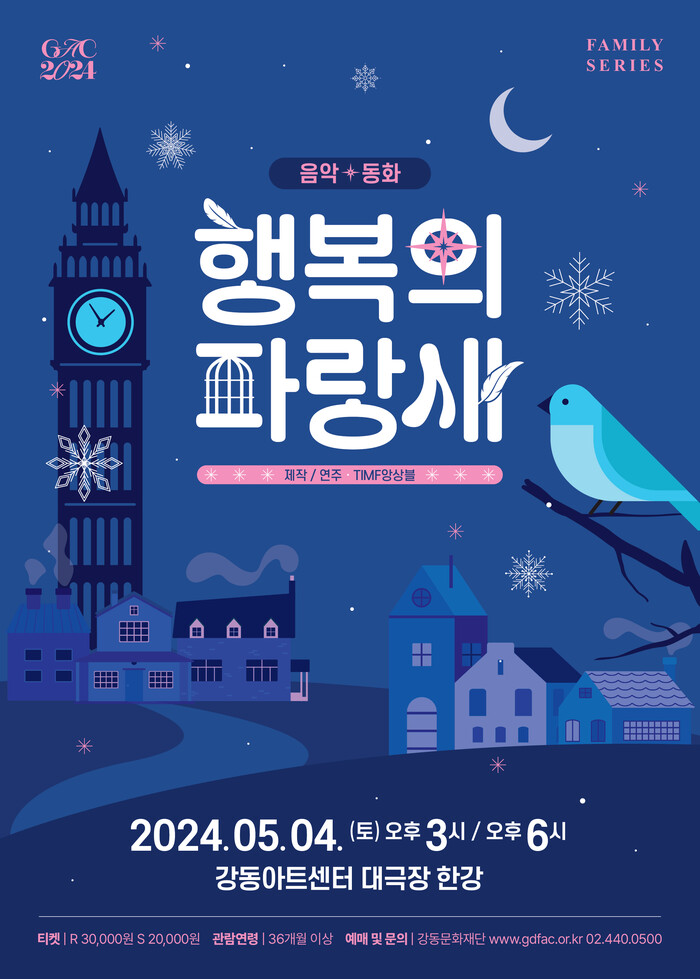구는 ‘행복의 파랑새’가 TIMF앙상블의 연주와 일러스트 삽화, 배우들의 연기를 더해 아이들이 상상력을 한껏 키우며 클래식 음악을 재미있게 관람할 수 있어 가정의 달인 5월에 온 가족이 함께 즐길 수 있는 공연이 될 것으로 기대하고 있다.