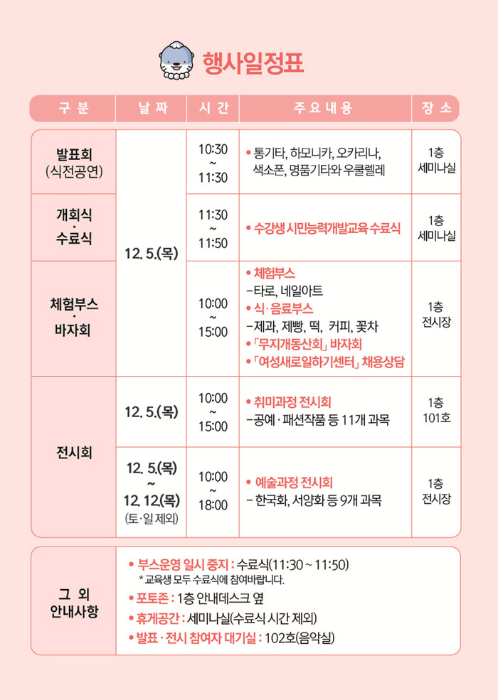 단, 12월 5일부터 12일까지 진행되는 그림 전시와 달리, 발표회, 공예 전시회, 체험 부스, 무지개동산회 바자회는 12월 5일 10시부터 15시까지 하루 동안만 진행된다.