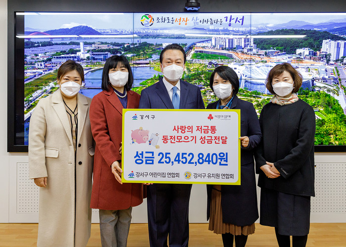 서울 강서구는 25일 국공립·민간·가정 어린이집연합회와 사립유치원연합회로부터 ‘사랑의 저금통’을 전달받았다. 성금은 총 2545만2840원으로 서울사회복지공동모금회를 통해 지역 저소득가구 중 소아암 및 희귀난치성 질환 환아 6명을 위해 쓰여질 예정이다. 사진은 노현송 구청장(가운데)과 관계자들이 기념촬영을 하는 모습. (사진제공=강서구청)