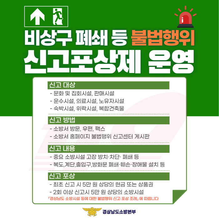 ‘비상구 폐쇄 등 신고포상제’는 피난ㆍ방화시설의 폐쇄이나 훼손, 장애물 적치 등 불법행위에 대한 시민의 자발적인 신고를 유도해 자율 안전관리 문화를 정착하고 대형 사고를 예방하는 데 크게 기여해 온 제도다.