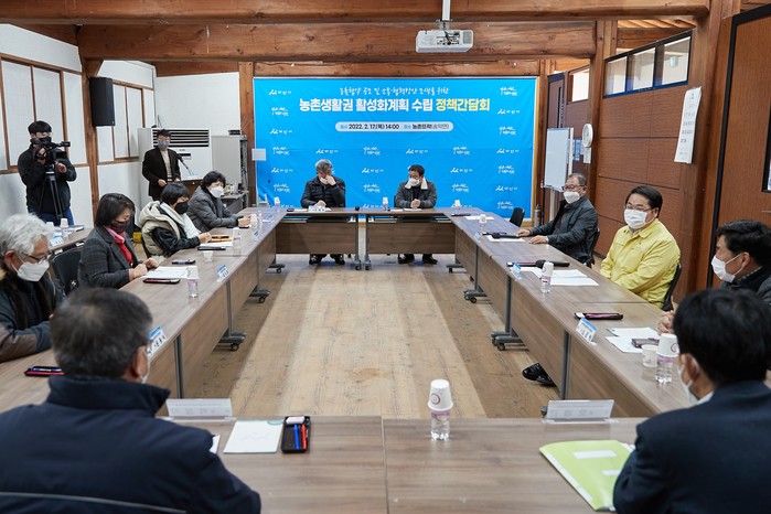 충남 아산시는 지난 17일 2022년 농림축산식품부 주관 농촌협약 공모 준비와 송악면 활성화 방안 등 다양한 현장의 목소리를 수렴하기 위해송악면 농촌생활권활성화계획 수립 추진위원회 위원과 정책간담회를 개최했다. 사진은 오세현 시장(오른쪽 가운데)이 간담회에서 대화를 나누고 있는 모습.(사진제공=아산시청)