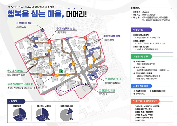 본 사업으로 ▲빈집정비, 슬레이트 철거, 지붕개량, 집수리 등 주택정비를 지원 ▲비상소화장치, 화재감지기, 스마트CCTV, 가로등, 노후담장 철거, 주차장 확충 등 안전시설을 확보 ▲안길정비, 재래화장실 철거, 경로당 리모델링, 공동체공간 조성 등 생활 인프라를 확충 ▲소방.방범대원, 골목가드너 양성교육 등 휴먼케어 및 주민 역량강화 사업을 2025년까지 추진할 계획이다.